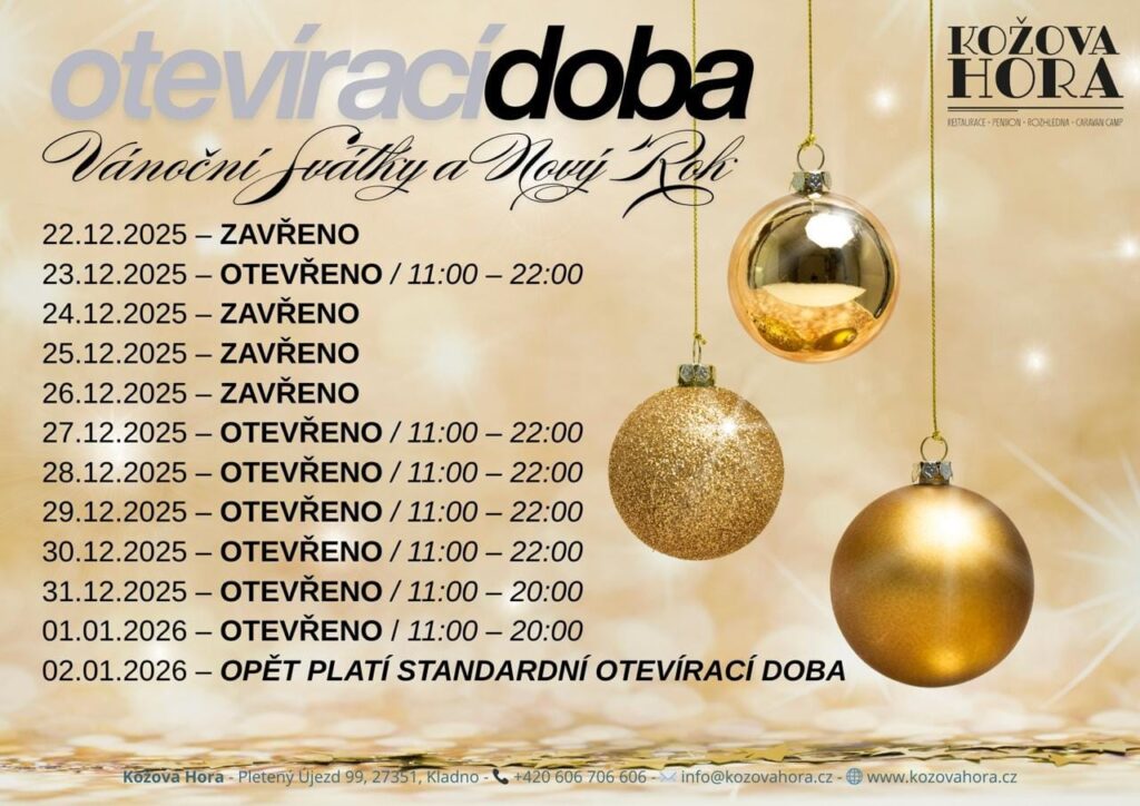 Vážení hosté, během Vánočních svátků a přes Nový rok máme otevřeno následovně. Těšíme se Přijďte si vychutnat tradiční kuchyni, výborné