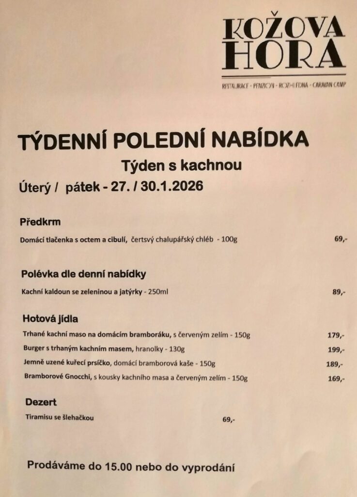 kožová horaDenní a týdenní menu a speciální nabídky Týdenní menuNaše týdenní menu pro vás s láskou a pečlivě připravujeme každý den. Speciální nabídka / týdenní menu: Neni kachna jako kachna – týdenní menu 26. – 30.1.2026 2026-01-27 Napište námV případě rezervace pobytu, nám napište i počet osob a datum příjezdu a odjezdu. Děkujeme. AdresaRestaurace a pension Kožova Hora Pletený Újezd 99, 273 51 – Kladno TELEFON+420 606 706 606 Emailinfo@kozovahora.cz SLEDUJTE NÁS NA: Jméno a příjmení Email TelefonUK (+44)USA / Canada (+1)Algeria (+213)Andorra (+376)Angola (+244)Anguilla (+1264)Antigua & Barbuda (+1268)Argentina (+54)Armenia (+374)Aruba (+297)Australia (+61)Austria (+43)Azerbaijan (+994)Bahamas (+1242)Bahrain (+973)Bangladesh (+880)Barbados (+1246)Belarus (+375)Belgium (+32)Belize (+501)Benin (+229)Bermuda (+1441)Bhutan (+975)Bolivia (+591)Bosnia Herzegovina (+387)Botswana (+267)Brazil (+55)Brunei (+673)Bulgaria (+359)Burkina Faso (+226)Burundi (+257)Cambodia (+855)Cameroon (+237)Cape Verde Islands (+238)Cayman Islands (+1345)Central African Republic (+236)Chile (+56)China (+86)Colombia (+57)Comoros (+269)Congo (+242)Cook Islands (+682)Costa Rica (+506)Croatia (+385)Cuba (+53)Cyprus North (+90392)Cyprus South (+357)Czech Republic (+420)Denmark (+45)Djibouti (+253)Dominica (+1809)Dominican Republic (+1809)Ecuador (+593)Egypt (+20)El Salvador (+503)Equatorial Guinea (+240)Eritrea (+291)Estonia (+372)Ethiopia (+251)Falkland Islands (+500)Faroe Islands (+298)Fiji (+679)Finland (+358)France (+33)French Guiana (+594)French Polynesia (+689)Gabon (+241)Gambia (+220)Georgia (+7880)Germany (+49)Ghana (+233)Gibraltar (+350)Greece (+30)Greenland (+299)Grenada (+1473)Guadeloupe (+590)Guam (+671)Guatemala (+502)Guinea (+224)Guinea – Bissau (+245)Guyana (+592)Haiti (+509)Honduras (+504)Hong Kong (+852)Hungary (+36)Iceland (+354)India (+91)Indonesia (+62)Iran (+98)Iraq (+964)Ireland (+353)Israel (+972)Italy (+39)Jamaica (+1876)Japan (+81)Jordan (+962)Kazakhstan (+7)Kenya (+254)Kiribati (+686)Korea North (+850)Korea South (+82)Kuwait (+965)Kyrgyzstan (+996)Laos (+856)Latvia (+371)Lebanon (+961)Lesotho (+266)Liberia (+231)Libya (+218)Liechtenstein (+417)Lithuania (+370)Luxembourg (+352)Macao (+853)Macedonia (+389)Madagascar (+261)Malawi (+265)Malaysia (+60)Maldives (+960)Mali (+223)Malta (+356)Marshall Islands (+692)Martinique (+596)Mauritania (+222)Mayotte (+269)Mexico (+52)Micronesia (+691)Moldova (+373)Monaco (+377)Mongolia (+976)Montserrat (+1664)Morocco (+212)Mozambique (+258)Myanmar (+95)Namibia (+264)Nauru (+674)Nepal (+977)Netherlands (+31)New Caledonia (+687)New Zealand (+64)Nicaragua (+505)Niger (+227)Nigeria (+234)Niue (+683)Norfolk Islands (+672)Northern Marianas (+670)Norway (+47)Oman (+968)Palau (+680)Panama (+507)Papua New Guinea (+675)Paraguay (+595)Peru (+51)Philippines (+63)Poland (+48)Portugal (+351)Puerto Rico (+1787)Qatar (+974)Reunion (+262)Romania (+40)Russia (+7)Rwanda (+250)San Marino (+378)Sao Tome & Principe (+239)Saudi Arabia (+966)Senegal (+221)Serbia (+381)Seychelles (+248)Sierra Leone (+232)Singapore (+65)Slovak Republic (+421)Slovenia (+386)Solomon Islands (+677)Somalia (+252)South Africa (+27)Spain (+34)Sri Lanka (+94)St. Helena (+290)St. Kitts (+1869)St. Lucia (+1758)Sudan (+249)Suriname (+597)Swaziland (+268)Sweden (+46)Switzerland (+41)Syria (+963)Taiwan (+886)Tajikstan (+7)Thailand (+66)Togo (+228)Tonga (+676)Trinidad & Tobago (+1868)Tunisia (+216)Turkey (+90)Turkmenistan (+7)Turkmenistan (+993)Turks & Caicos Islands (+1649)Tuvalu (+688)Uganda (+256)Ukraine (+380)United Arab Emirates (+971)Uruguay (+598)Uzbekistan (+7)Vanuatu (+678)Vatican City (+379)Venezuela (+58)Vietnam (+84)Virgin Islands – British (+1284)Virgin Islands – US (+1340)Wallis & Futuna (+681)Yemen (North)(+969)Yemen (South)(+967)Zambia (+260)Zimbabwe (+263) Vaše zpráva OdeslatThe form has been submitted successfully!There has been some error while submitting the form. Please verify all form fields again.